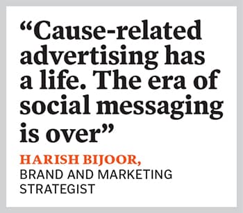 “The era of social messaging is over," says Harish Bijoor, who runs an eponymous brand consulting firm. For long-running social messaging by brands, there’s a certain degree of boredom that sets in, he says. “Cause-related advertising has a life and expiry date," he underlines, adding that over the last few years a bunch of brands created outstanding work, including Tata Tea’s Jaago Re and detergent Ariel’s two bucket water campaign. With the sway of social media today, brands’ social messages get muted. “Social media is the ultimate social messenger," he says. No amount of advertising, Bijoor lets on, can that. “Passion of individuals or set of individuals can’t be bettered by brands," he adds.