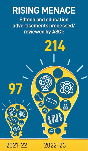 Have a look. A bunch of loaded edtech startups—lead being taken by coding startups—bombard social media and television with outrageous commercials that sharply drive one message to parents: You are missing out. From ‘the next billion-dollar idea can come from your kids’ to ‘Silicon Valley is waiting for the tech geniuses’ to ‘make your child a TedX speaker’ or ‘an app developer’ to ‘two-teacher’ tuition will lead to better results, edtech startups played out every trick in the book to trick parents into a false sense of realisation that the future of their kids is in danger if they don’t use their services. No wonder, the Advertising Standards Council of India (ASCI) was swamped with complaints filed by agitated consumers. Look at the number of advertisements processed and reviewed by ASCI: From 97 in 2021-22, the numbers jumped to a staggering 214 in 2022-23.