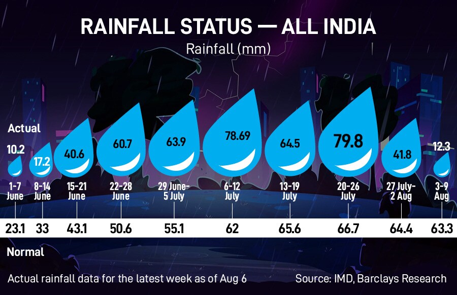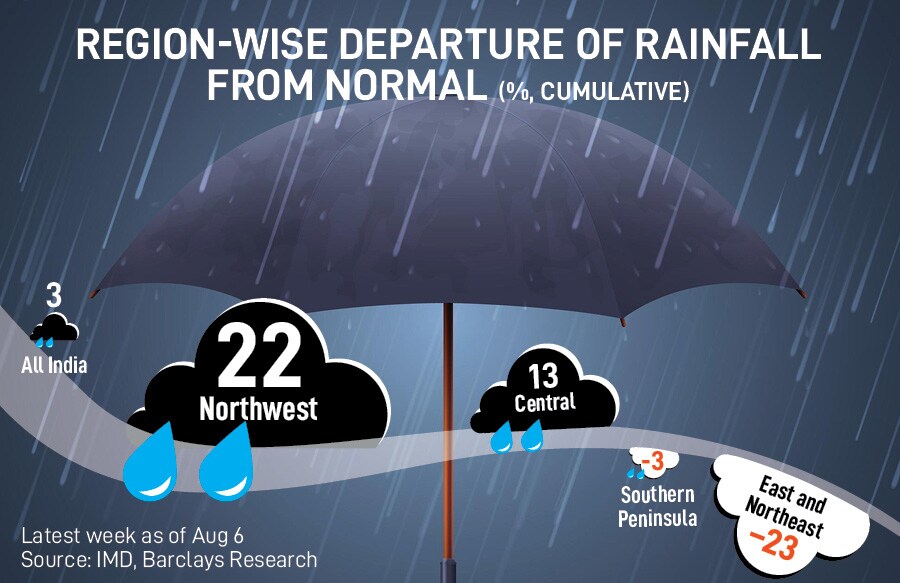 While rainfall distribution continues to improve across most regions, deficit in the eastern region persists at more than 20 percent, according to an analysis by Barclays based on Indian Meteorological Department (IMD) data. Excessive rains have reduced in the north and northwestern regions, while the southern and central regions are seeing ‘normal’ rainfall.