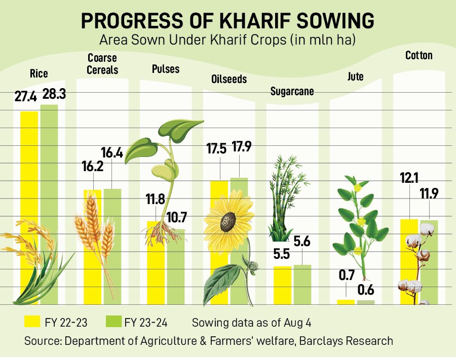 Sowing of pulses is lagging, at 11 percent below last year’s level, delayed by patchy monsoon rainfall in producer states Maharashtra and Karnataka in July. Among key crops, rice sowing is more than previous year’s, largely due to area sown in Uttar Pradesh and Punjab. In West Bengal, the largest rice-producing state, the area sown is only 25 percent of “normal", according to Barclays analysis.
