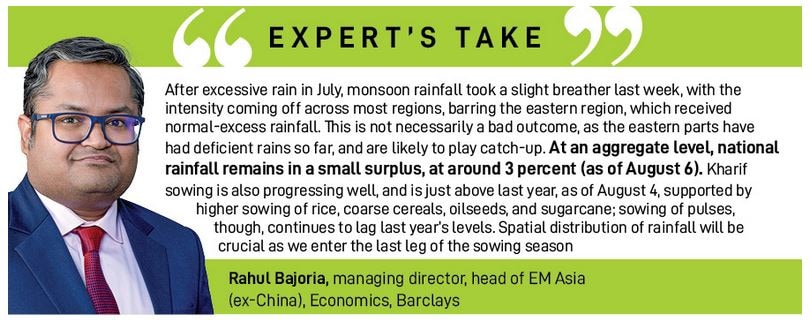 After excess rain in July, monsoon rains slowed down in the past week, even as cumulatively rainfall remained in surplus, at around 3 percent above the long period average (LPA). The period under consideration is till August 6.