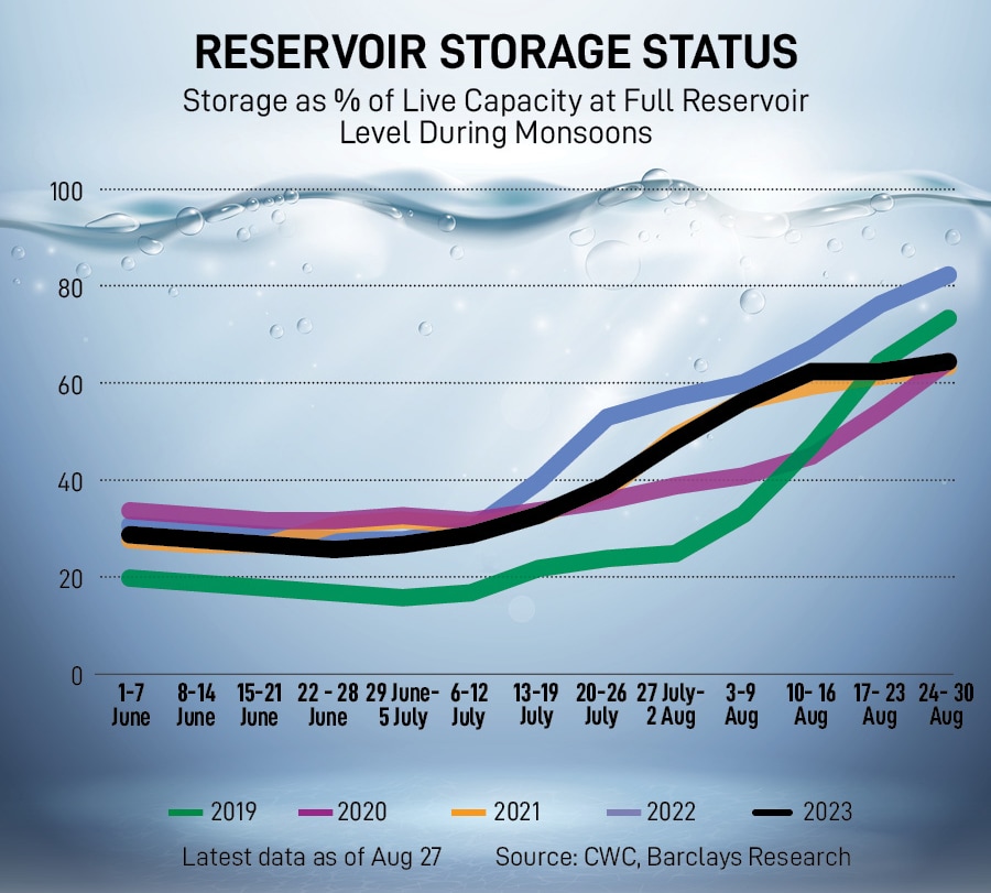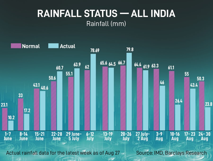 With August drawing to a close, monsoon rainfall continued to remain weak, raising concerns over crop cultivation impacting inflation, while water reservoir storage levels are low. Cumulatively, pan-India rainfall is 7.6 percent below long period average (between June 1 and August 27), shows an analysis by Barclays based on Indian Meteorological Department (IMD) data.