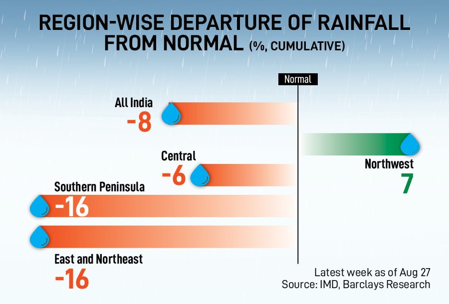 The uneven distribution of rainfall continued, with southern regions going further into deficit and the eastern region’s large deficiency persisting. “Monsoon rainfall continues to be deficient, with uneven distribution on a cumulative basis. With completion of kharif sowing, adequate rainfall in the remaining monsoon period will be critical for crop maturity," says Barclays.