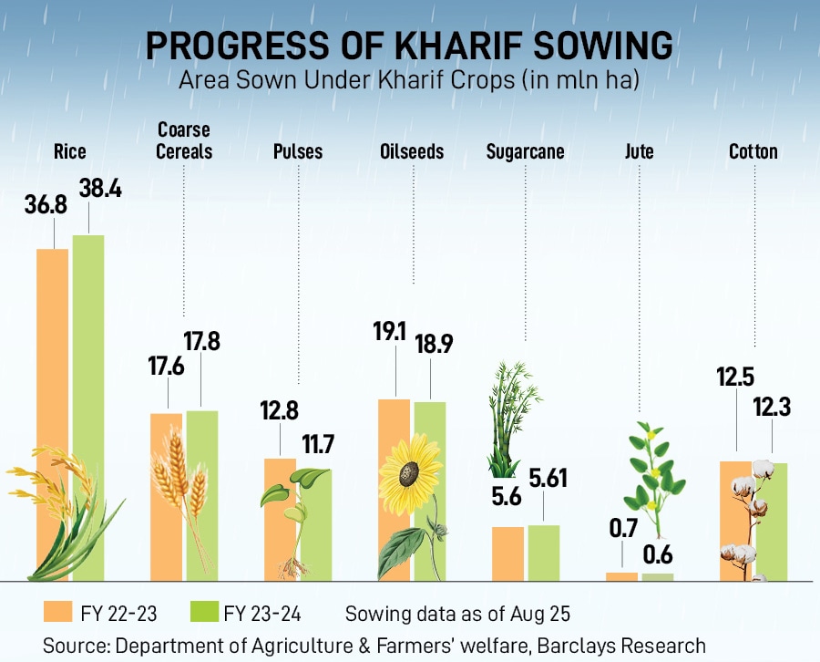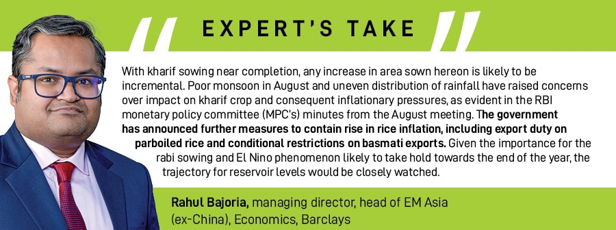 Any further increase over the rest of the monsoon period will largely be incremental as the area sown through August 25 was tad above the corresponding period of 2022. “Reduced sowing for pulses is a cause for concern, at just above 80 percent of the normal area sown. Within the major producer states, sowing in Maharashtra and Karnataka is lagging because of patchy rainfall," says Rahul Bajoria, managing director, head of EM Asia (ex-China), economics, Barclays.