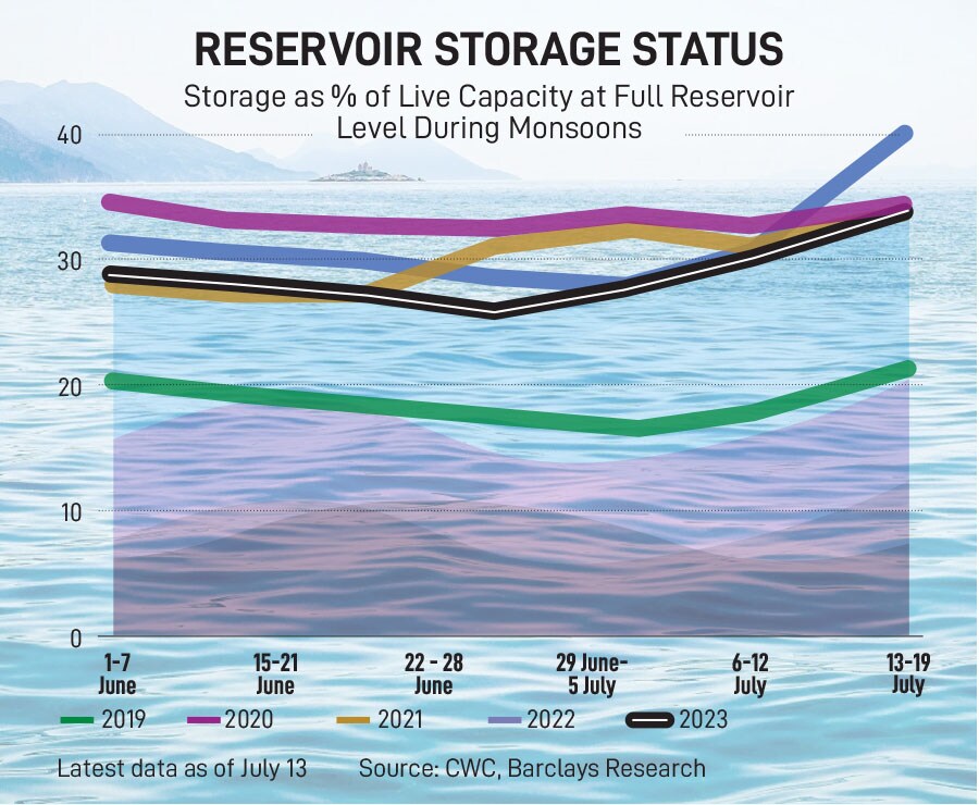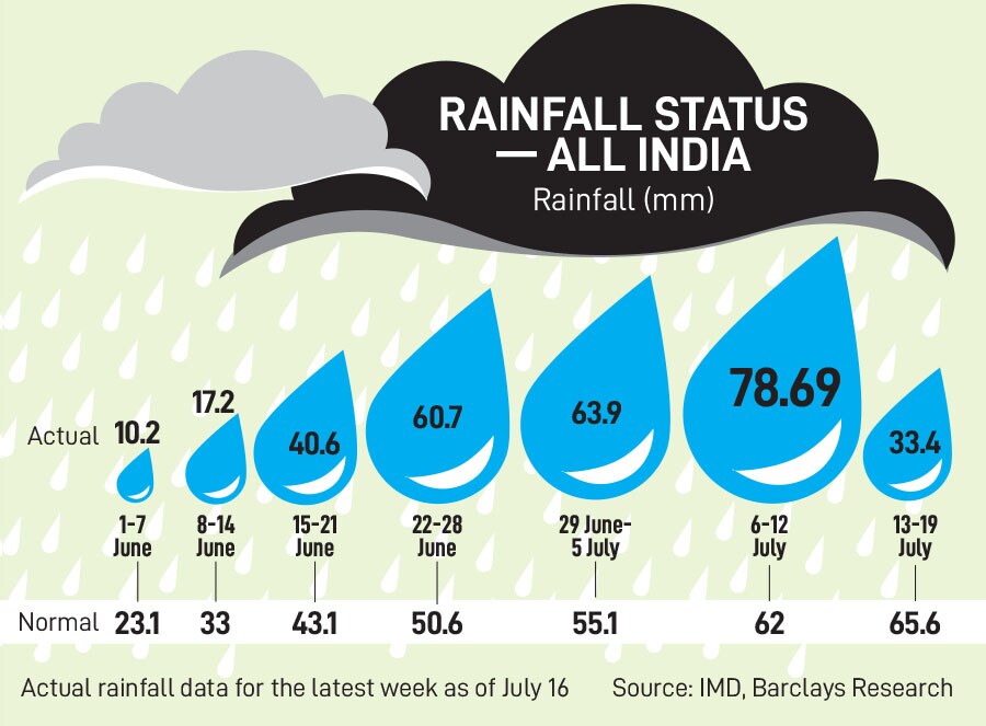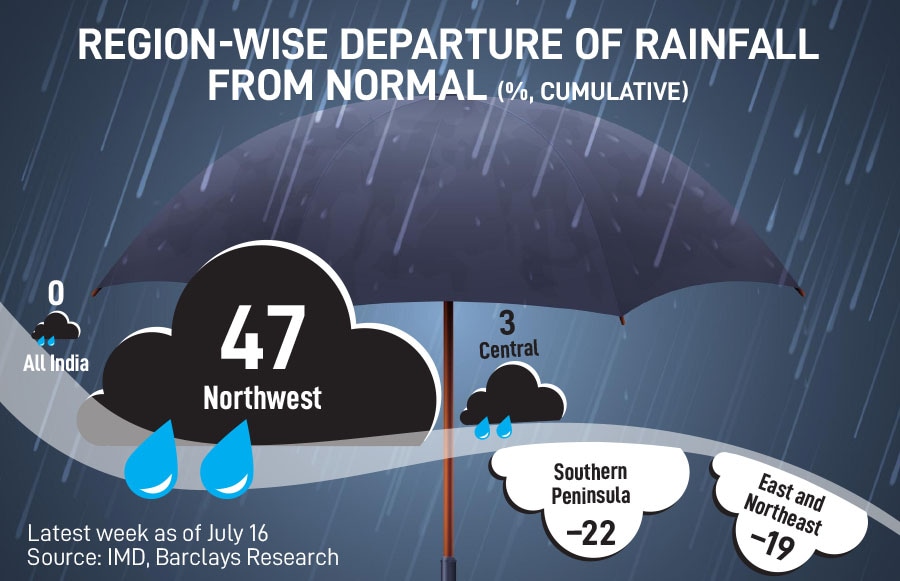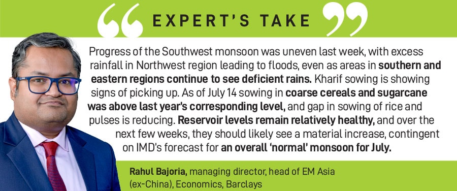 Deficits in the southern and eastern regions continued but decreased week-on-week, and the central region now has surplus rain. Cumulatively, between June 1 and July 13, pan-India monsoon rainfall was 1.4 percent above the long-period average (LPA), shows Indian Meteorological Department (IMD) data analysis by Barclays.