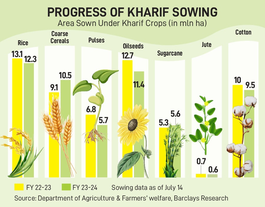 The area sown for kharif crops through July 7 was 42.16 mn ha, 5.4 percent below the corresponding period of 2022, which was 44.59 mn ha. Rice and pulses sowing is lagging, largely due to low rainfall in the major producer states like West Bengal (for rice) and Maharashtra and Karnataka (for pulses). Sowing of coarse cereals is up on an annual basis due to early rains in Rajasthan.