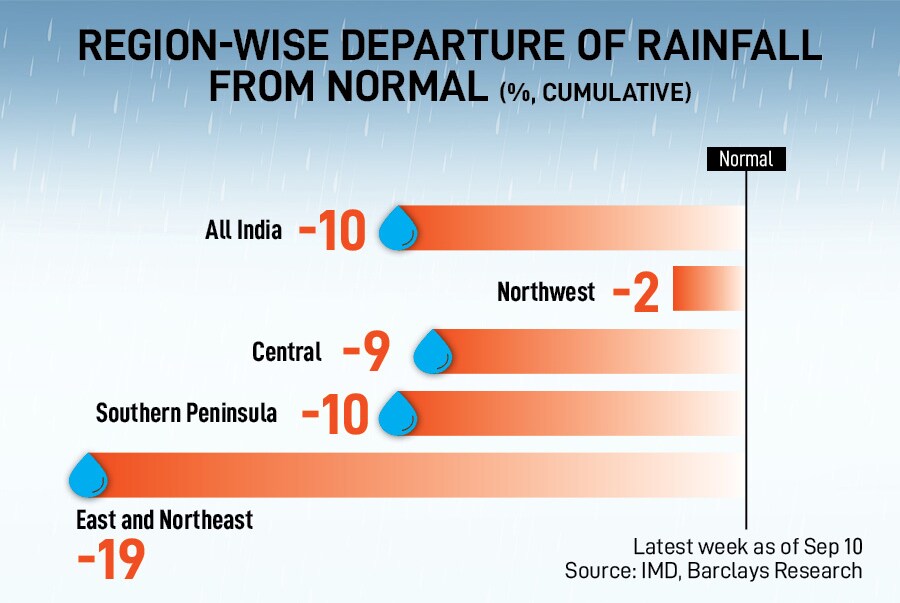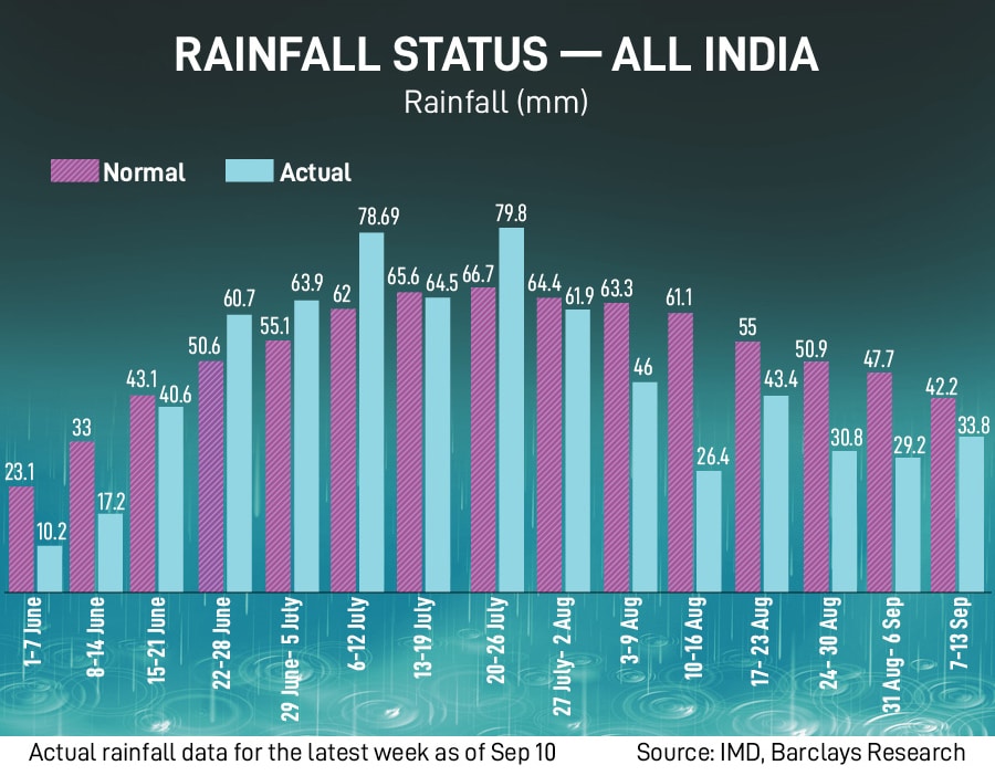 According to Barclays, with IMD’s forecast for ‘below normal’ rainfall for most parts of the country in September (barring the eastern region), the rainfall deficit may not be reversed completely in the rest of the season. Earlier, IMD forecasts estimated monthly rainfall to be normal at 91-109 percent of LPA in September with above-normal rainfall in the east and Northeast, but likely below-normal rainfall for the rest of the country.