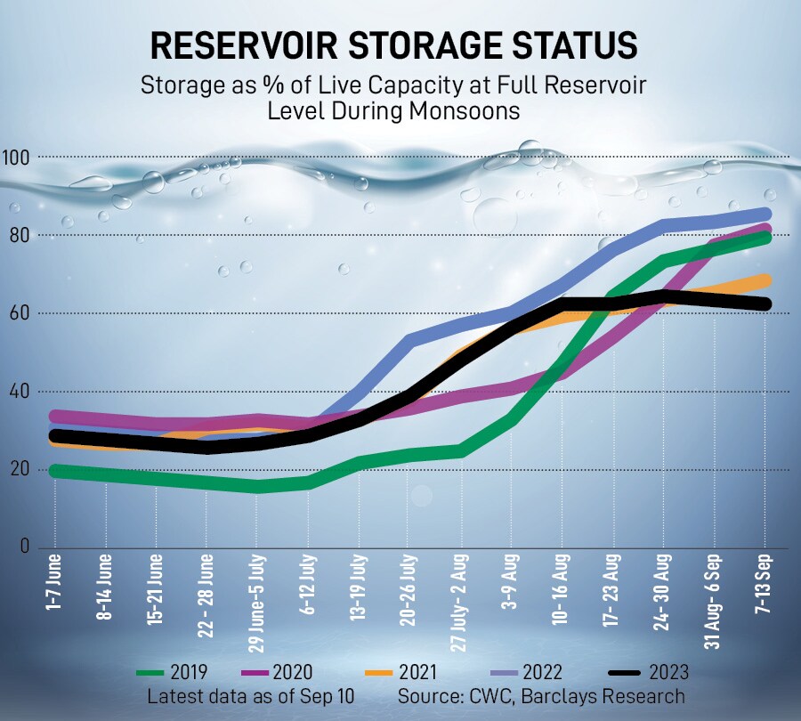 Current reservoir levels are 84 percent of the 10-year average. The drop in reservoir levels is now a material concern for the rabi winter crop, and may also spark fears of water rationing going into the festive season.