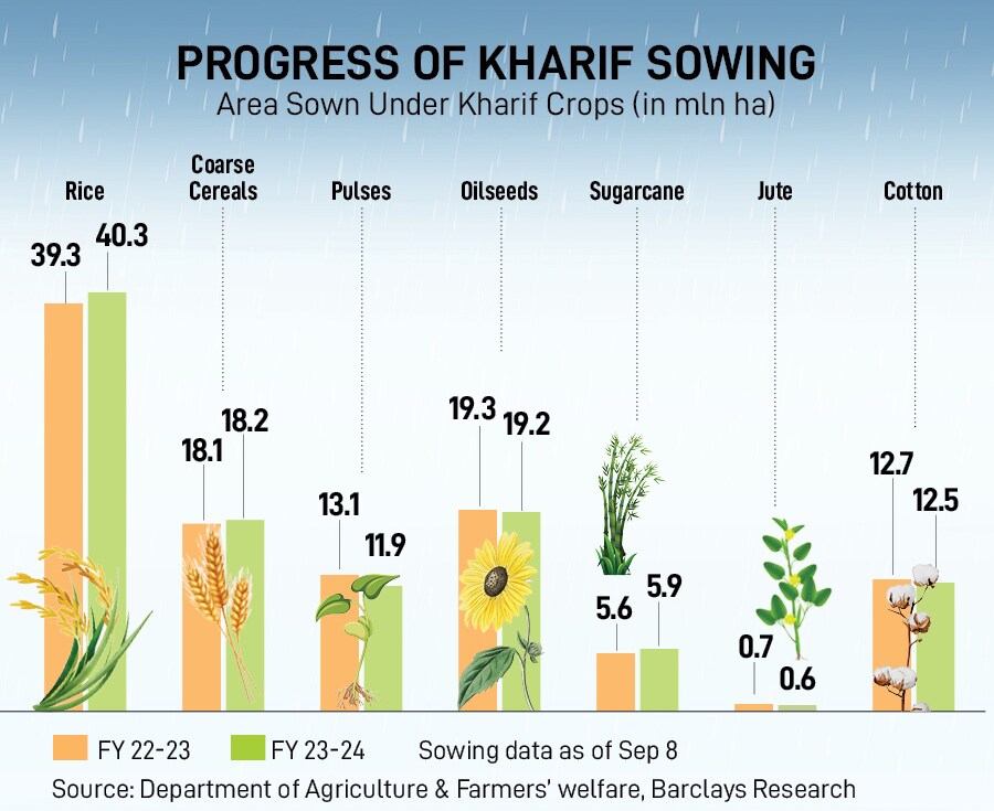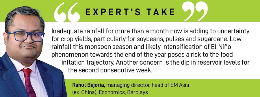 Kharif sowing is complete, but lack of adequate rainfall for more than a month may lead to uncertainty for crop yields. Apart from soybeans and pulses, the yield of irrigation-intensive sugarcane also could be threatened, particularly owing to deficient rainfall in major producer states like Maharashtra, says Barclays.