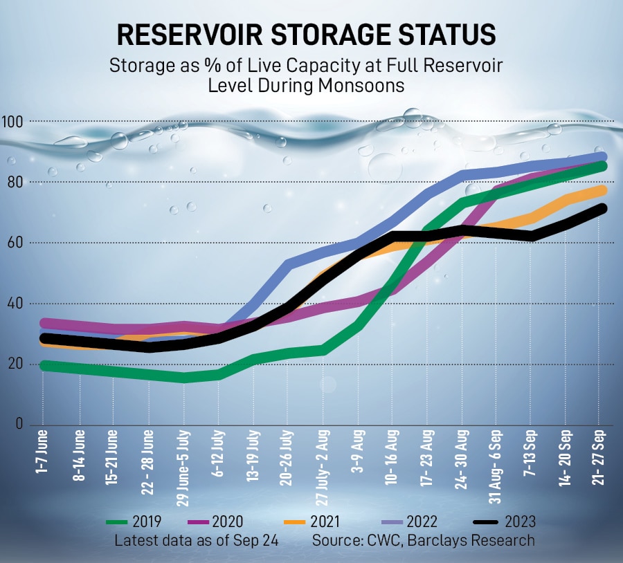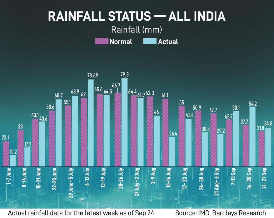 Cumulatively, pan-India rainfall deficit in the period June 1 to September 24 has reduced to 5.6 percent from 8 percent in the previous week, according to Barclays analysis based on Indian Meteorological Department (IMD) data. However, the late surge of "large excess" rainfall in Gujarat, Madhya Pradesh, and Rajasthan led to heavy flooding, thus the distribution of rainfall remains erratic.