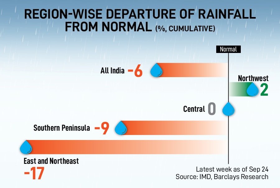 With just another week to go before the season ends, it is likely that the cumulative rainfall deficit will remain below 10 percent, marking an overall normal monsoon season for the current year, in line with IMD’s forecasts, says Barclays. Monsoon rainfall within (+/-) 10 percent of long period average (LPA) for the pan-India region is typically considered normal.