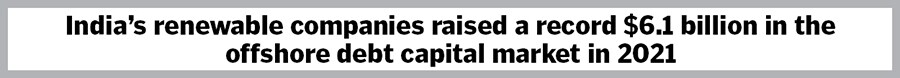 India’s renewable companies raised a record $6.1 billion in the offshore debt capital market in 2021, with several debut Indian renewable issuers. For example, Greenko raised the largest single tranche offshore green bond offering at $1 billion by an Indian renewable group. UltraTech issued the first SLB out of India with a $400 million maiden issue in February. We also saw social and sustainable bonds being issued offshore by Indian financial institutions. Axis Bank’s $600 million AT1 capital issuance marked the first sustainable USD bond out of the banking sector whereas Shriram Transport Finance raised $725 million through a social label.