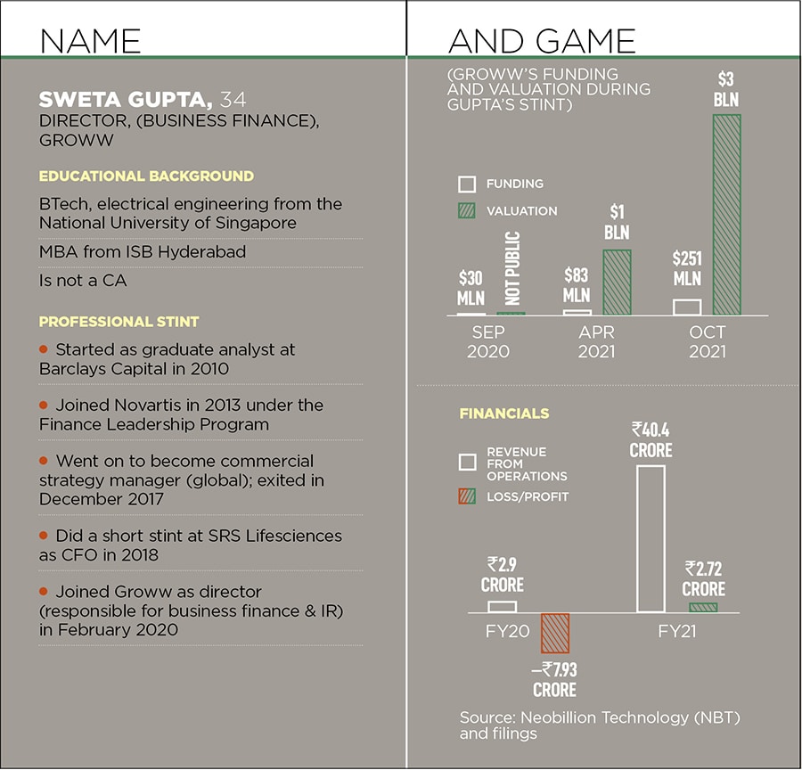 After six months of nays the elusive yes came along. And it was not from a traditional company but fintech startup Groww. “I was the first finance leadership hire for them," says the 34-year-old, who joined the company in February 2020. Over the next few months, Gupta proved a point to herself. Questions were raised about her abilities, and she answered them. In September, Groww raised $30 million. Seven months later, in April 2021, the startup raised $83 million at a valuation: of $1 billion. Groww became a unicorn.