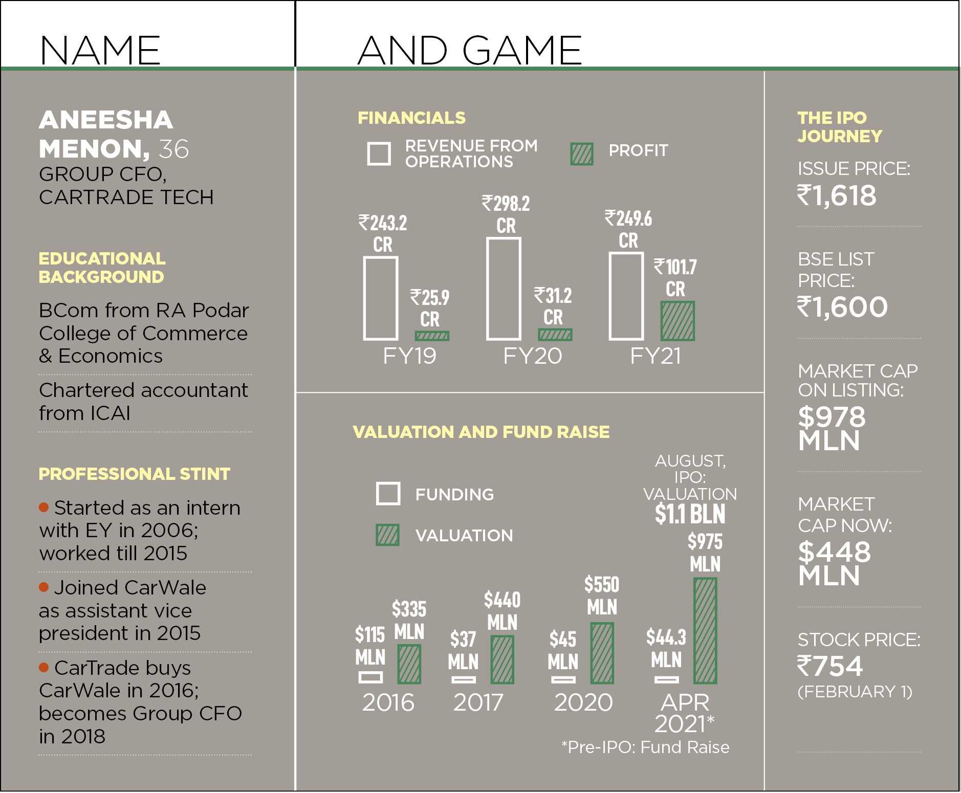 Back in August 2021, when CarTrade got listed, lady luck didn’t smile much. For a company which had been posting consistent profit—₹25.9 crore and ₹31.2 crore in FY19 and FY20, respectively—and a steady revenue—₹243.2 crore and ₹298.2 crore during the same period—a good listing was expected, if not a blockbuster one. The reality was somewhat different. The company got listed at 1 percent discount to the issue price of ₹1,618. “It felt like ouch. We deserved better," Menon recounts.