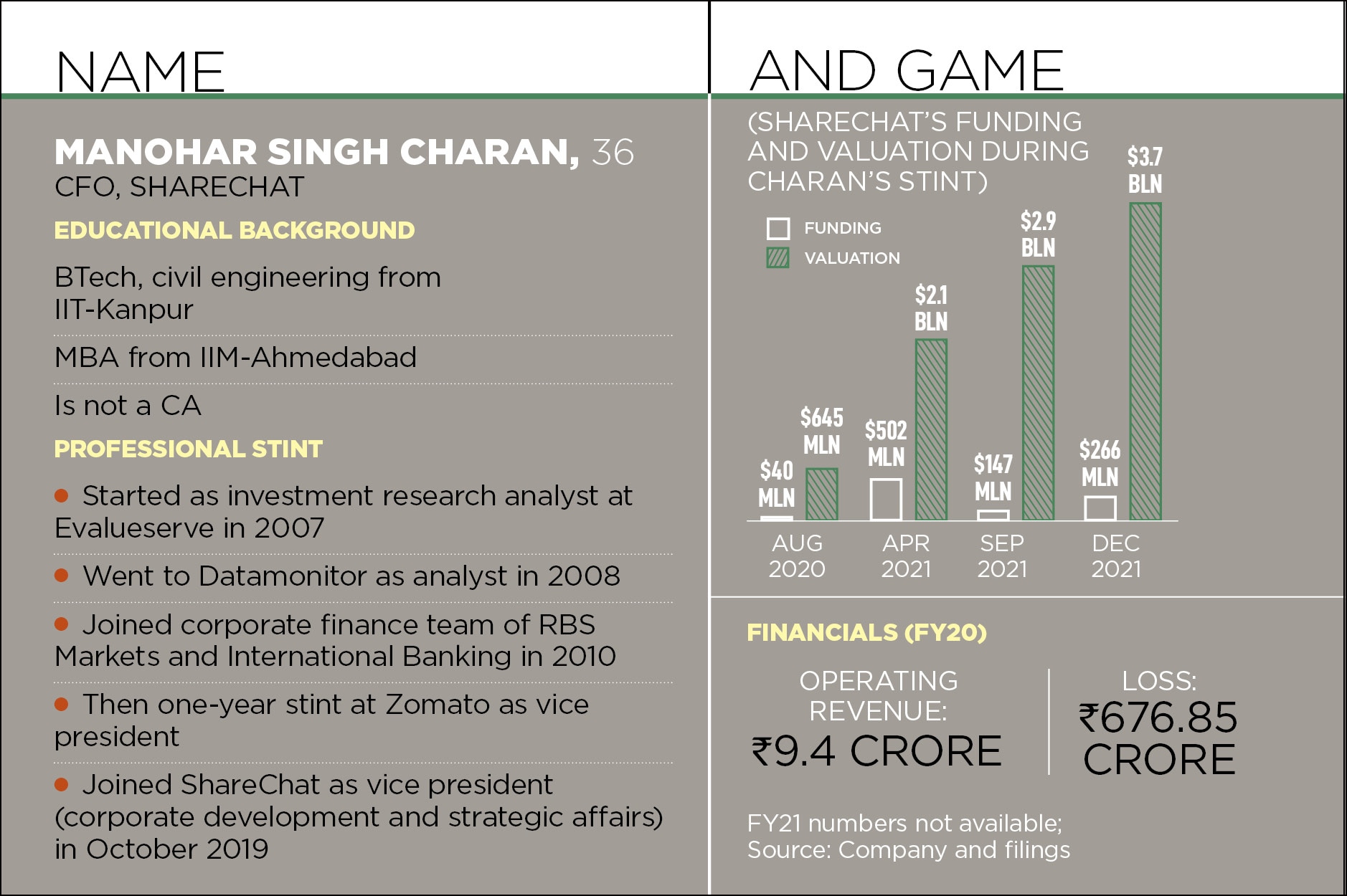 A few months later, in February 2021. ShareChat, a vernacular social media and short video entertainment platform, had posted its first operating revenue in six years: ₹9.4 crore. The loss, in a glaring contrast, stood at ₹676.85 crore. For a company which had raised $40 million in August 2020 at a valuation of $645 million, the ‘disastrous’ FY20 numbers were nothing to talk about. Understandably, Manohar Singh Charan, who joined ShareChat as CFO in October 2019, had a lot to explain.