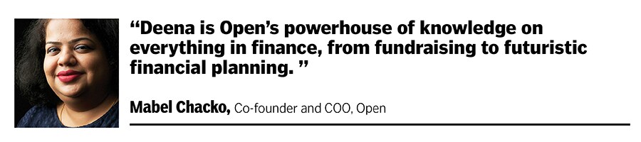 “Deena is Open’s powerhouse of knowledge on everything in finance, from fundraising to futuristic financial planning. It is commendable what she has achieved over the years as an entrepreneur, leader, and one of the most sought-after women in finance in the country," says Mabel Chacko, co-founder and COO, Open. In October 2021, the startup raised $100 million in a funding round led by Singapore’s sovereign wealth fund Temasek, along with participation from other new investors like tech major Google, card operator Visa and Japan’s SBI Investment.