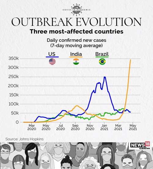 India, US and Brazil have taken turns to top the Covid-19 charts in terms of new cases, active infections and 7-day moving average. A look at how the pandemic has evolved in the three countries from M