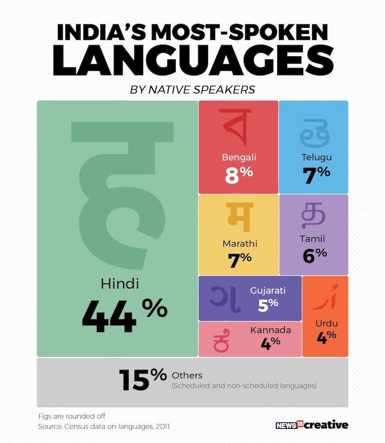 44% of India speaks Hindi, while the second most-spoken language, by native speakers, is Bengali. Take a look at the percentage share various languages command