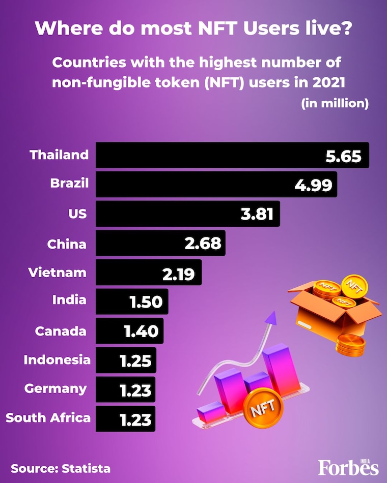Thailand has the highest number of NFT users, followed by Brazil and the US. Here's a look at the top 10 countries with the most users of non-fungible tokens in 2021