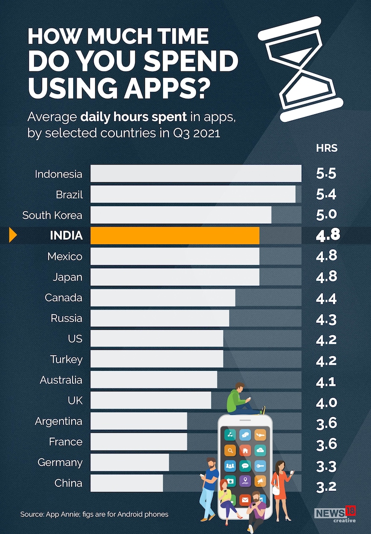 Indonesians top the list with 5.5 hours spent on mobile apps on average every day, Indians spend about 4.8 hours while Chinese spend a low 3.2 hours on apps daily
