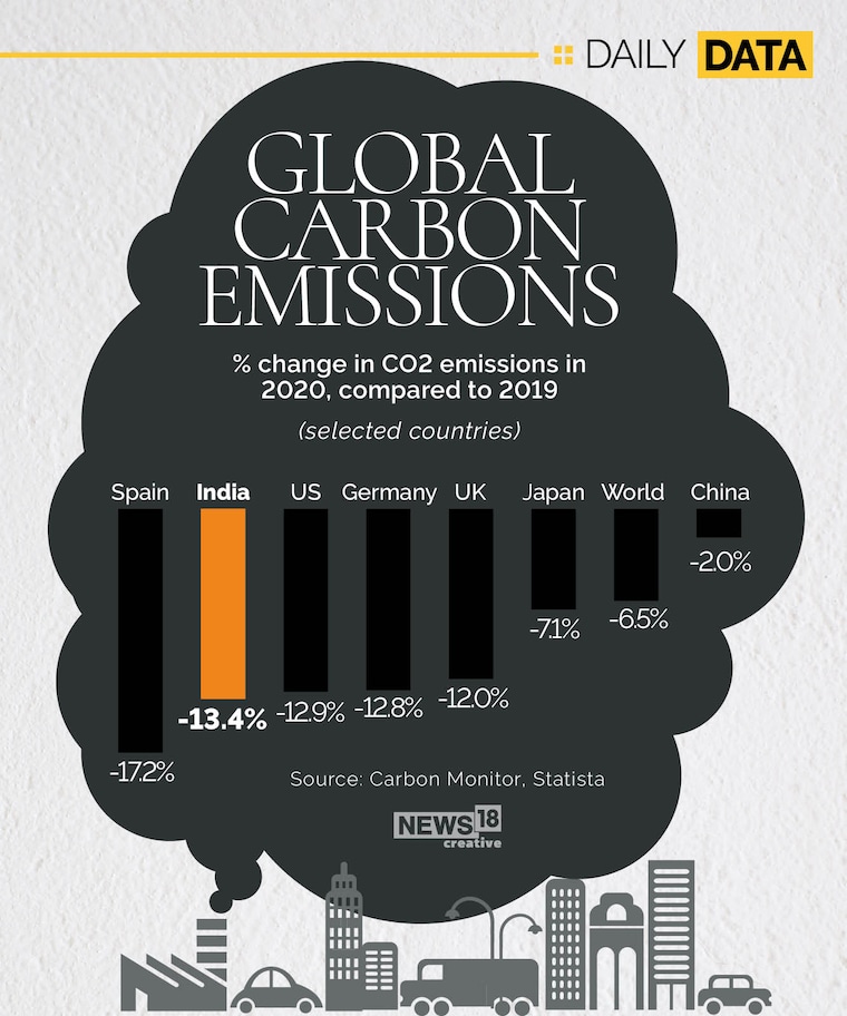 A look at the percentage change in CO2 emissions across countries, including India, this year, compared to 2019