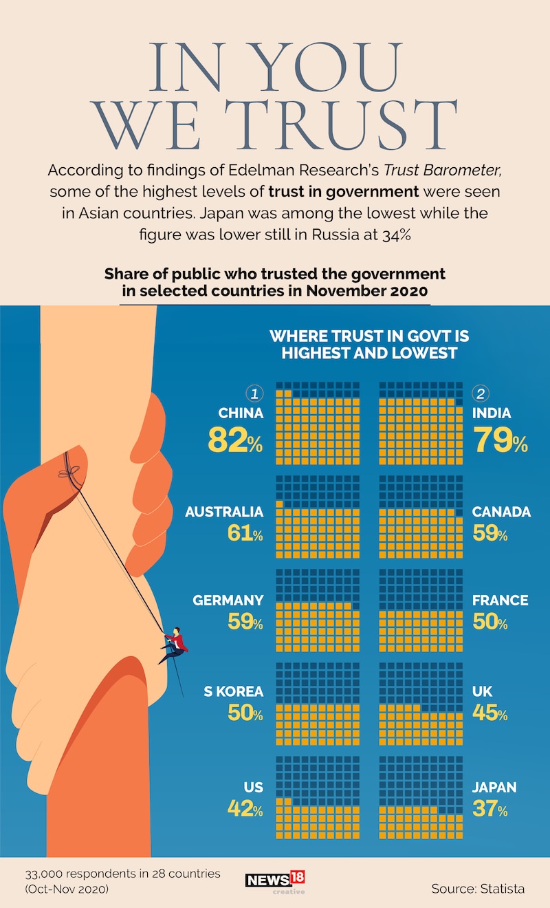 Some of the highest level of trust in government exists in Asian countries, according to findings of Edelman Research's Trust Barometer—while Japan was among the lowest in the list, India ranked among