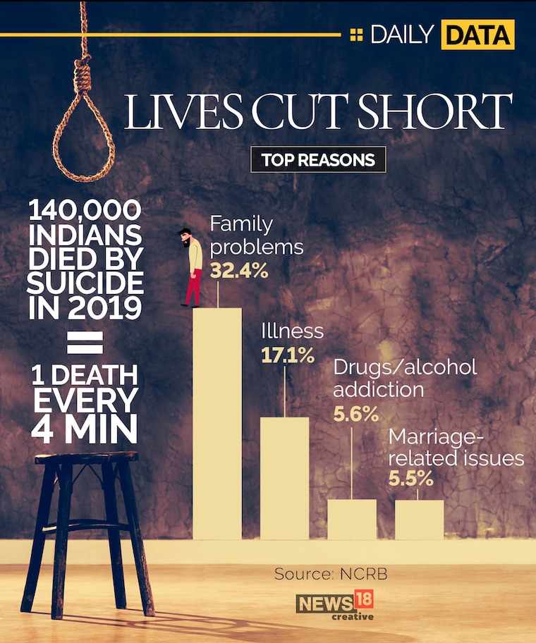In 2019, 140,000 Indians died by suicide, with top reasons ranging from family problems to marital issues