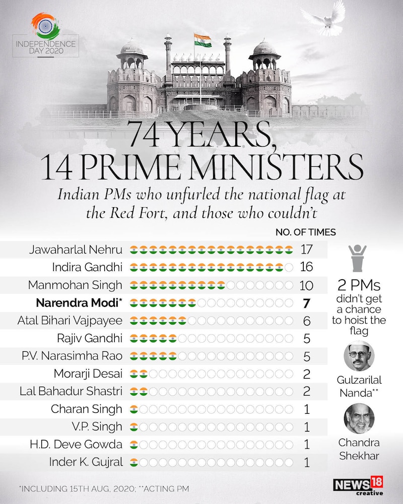 In 74 years celebrating Independence Day, 14 Prime Ministers have hoisted the Indian flag in ceremony. Modi will be the first non-Congress PM to do so seven years in a row