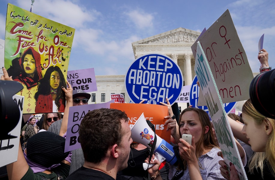 Anti-abortion and abortion-rights demonstrators mix outside the Supreme Court following a leaked draft opinion that the Supreme Court has potentially voted to overturn Roe V. Wade, in Washington, May 3, 2022. The Supreme Court on Tuesday confirmed the authenticity of a leaked draft ruling overturning the Roe v. Wade decision establishing a constitutional right to abortion but stressed that it was not final even as the disclosure triggered a political earthquake with potentially broad electoral and legal consequences. (Leigh Vogel/The New York Times)