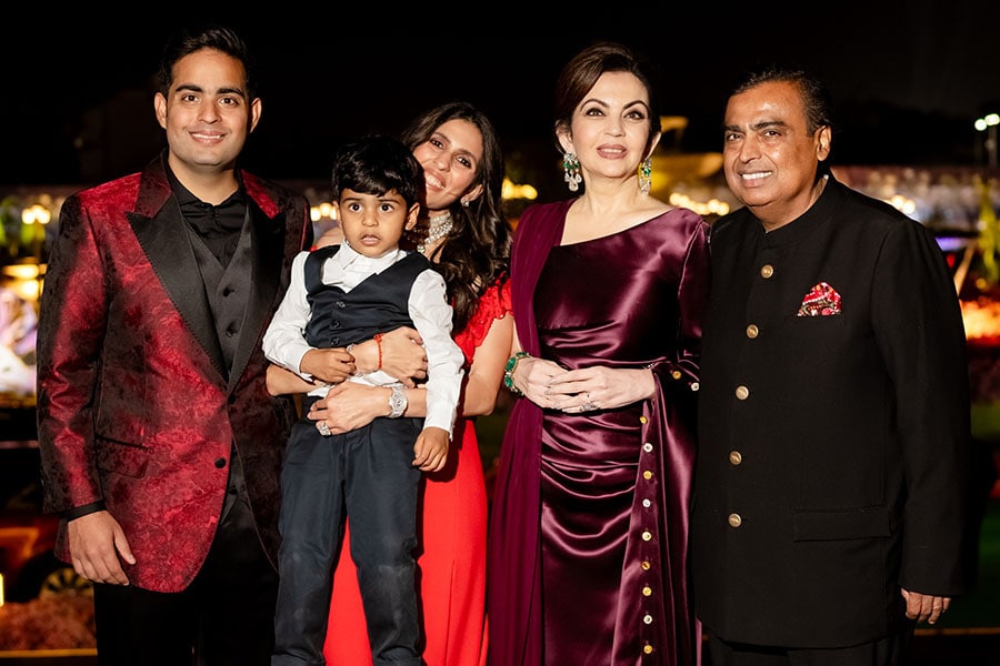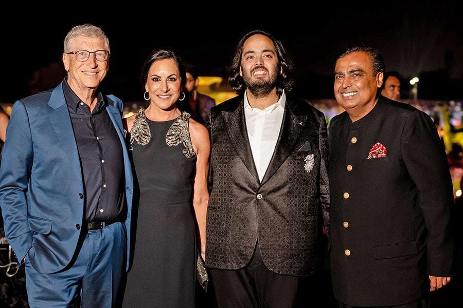 Bill Gates, co-founder of Microsoft, and his partner Paula Hurd pose for the cameras with groom-to-be Anant Ambani and beaming father Mukesh Ambani.