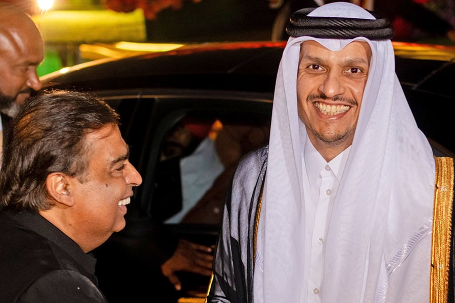 Mukesh Ambani welcomes Sheikh Mohammed bin Abdulrahman bin Jassim Al Thani, the Prime Minister of Qatar, at the pre-wedding celebrations.