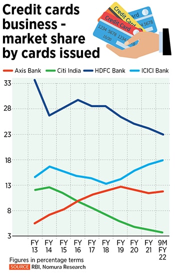In March, e-commerce giant Flipkart and Axis Bank announced that their co-branded credit card, ‘Flipkart Axis Bank Credit Card’ launched in 2019, had crossed the two million Cards in Force (CIF) milestone. ICICI Bank has an equally successful tie-up with Amazon India. But, with the entry of aggressive private sector lenders, Citibank has been losing market share in the credit cards space to 3.7 percent in December 2021 from 12 percent as of March 2013.