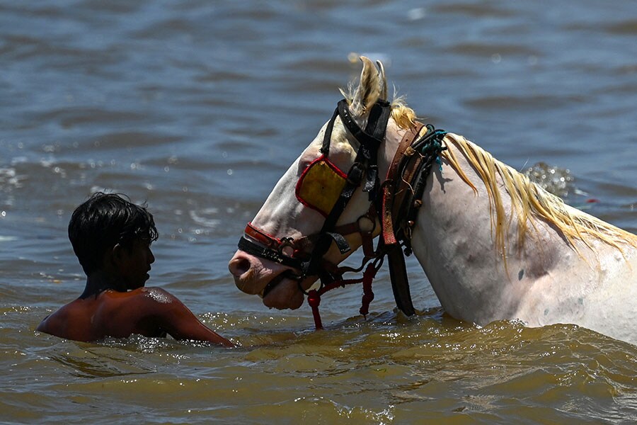A caretaker takes his horse for a dip in the sea on a hot summer day in Mumbai on May 8, 2024. As temperatures soar across India, several states have announced early summer vacations for schools to ensure the well-being of students amid the scorching heatwave.