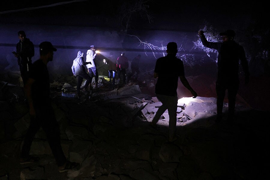 Palestinians use flashlights to look for survivors in a residential building that was hit by Israeli bombardment in Rafah in the southern Gaza Strip on May 7, 2024, amidst the ongoing conflict between Israel and the militant group Hamas.