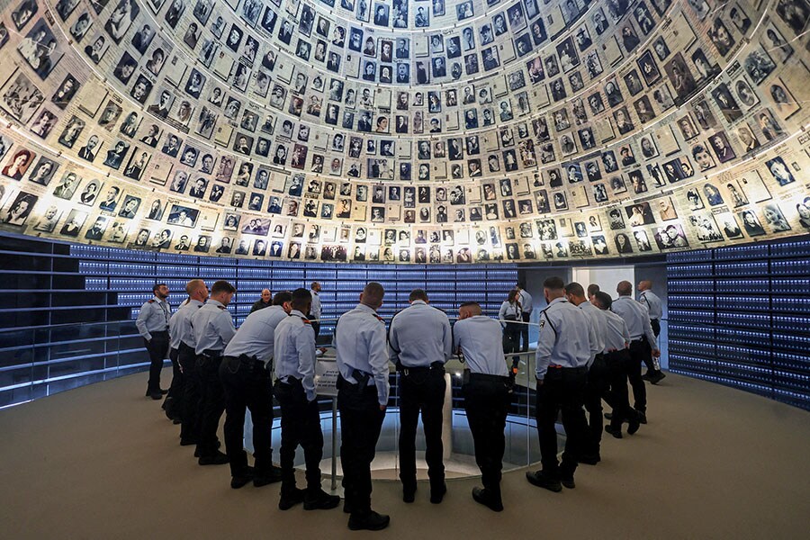 Visitors tour an exhibition at Yad Vashem, Israel"s official memorial centre to the victims of the Holocaust, in Jerusalem on May 5, 2024. This year"s Holocaust Remembrance Day comes amidst the ongoing war in Gaza, where Hamas is still holding more than 100 Israeli hostages, and almost 35,000 people have been killed during a retaliatory military operation by Israel.