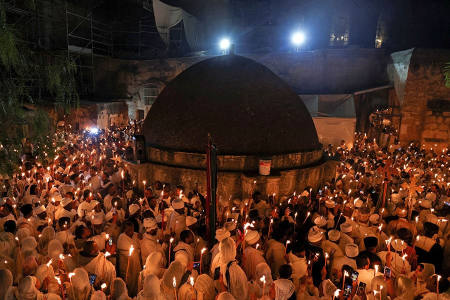 Ethiopian Orthodox faithful take part in the Holy Fire ceremony at the Ethiopian section of the Church of the Holy Sepulchre on May 4, 2024, to celebrate Easter in Jerusalem"s Old City. While most Western churches observe Easter on March 31, Eastern Orthodox churches follow the older Julian calendar, marking the holiday worldwide on Sunday.