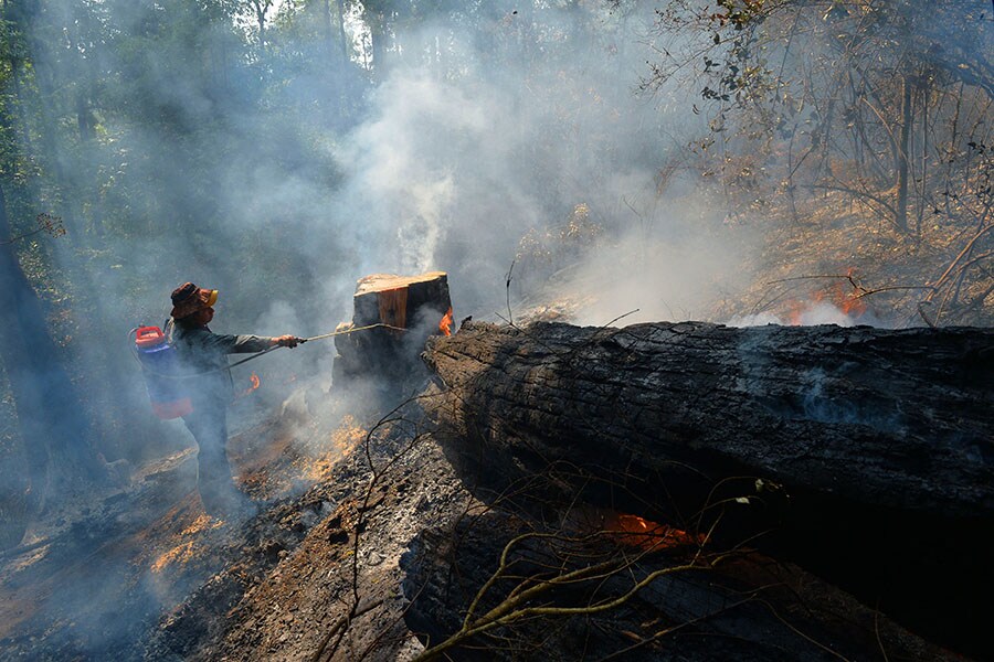 A volunteer firefighter works to put out a fire among charred trees in the community of Pinal de Marquesado in Otzoloapan, Mexico State, on May 6, 2024. On Monday, the National Forestry Commission (Conafor) reported that currently there are 131 active fires in 21 Mexican states, which have burned some 63,000 hectares, and 19 of them are in protected natural areas.