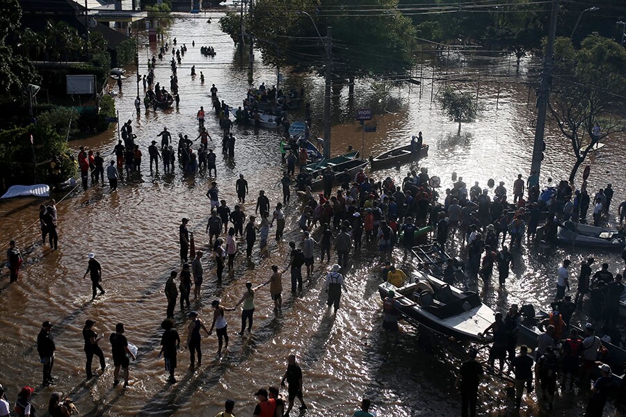 Volunteers form a human corridor to receive boats with people rescued from flooded areas at the Sao Joao neighbourhood in Porto Alegre, Rio Grande do Sul state, Brazil on May 7, 2024. Since the unprecedented deluge started last week, at least 85 people have died, and more than 150,000 were ejected from their homes by floods and mudslides in Rio Grande do Sul state, authorities said.
