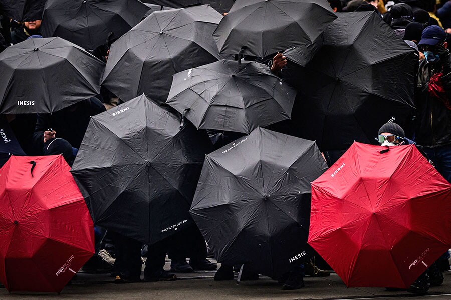 Protesters protect themselves with open umbrellas during altercations with French anti-riot police during a May Day (Labour Day) rally, marking International Workers" Day, in Nantes, western France, on May 1, 2024. The CGT union said more than 200,000 people took to the streets across France, making demands ranging from better salaries to a ceasefire in Gaza.
