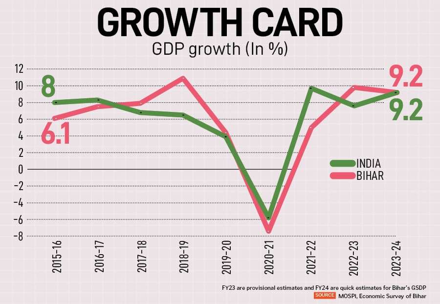 Bihar’s gross state domestic product (GSDP) growth rate was an estimated 9.2 percent in FY24, matching the all-India figure. This is in stark contrast to a decade ago when the state’s growth rate lagged the country figures. This growth, which is highly concentrated around the capital city of Patna, has not been sufficient to solve the core economic issues of unemployment and mass migration, which are key in the ongoing electoral context.