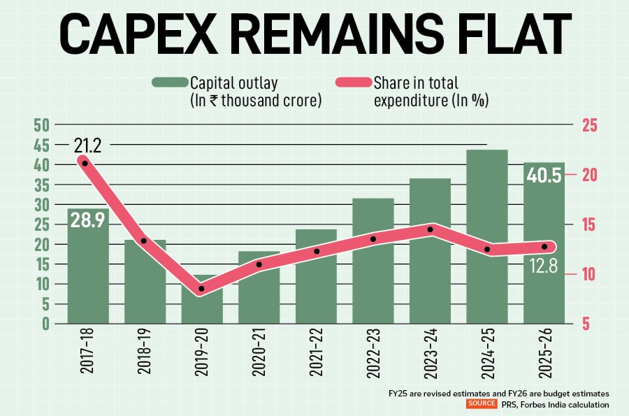 Even as Bihar has considerable headroom for development spending, its capex ratio (relative to total expenditure) remains stagnant. Though capex (in absolute figures) has increased by 51 percent from FY18 to Rs43,700 crore in the FY25 (revised estimates), its share in the total expenditure of the state remains largely flat. In fact, in the last four years the capex ratio has remained between 12 percent and 14 percent, marking a sharp decline from the 21 percent ratio recorded in FY18. In the meantime, the average capex spends for states across the country increased from 12 percent to 15 percent in FY25.