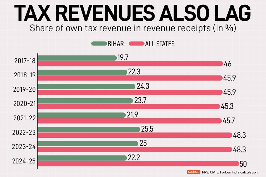 The state is also facing a persistent problem with generating adequate internal resources. Bihar’s own tax revenue (relative to revenue receipts) is alarmingly low and has failed to cross 30 percent in recent years. In FY25, it is projected at 22 percent, a sharp contrast to the average for all states which is budgeted at 50 percent.