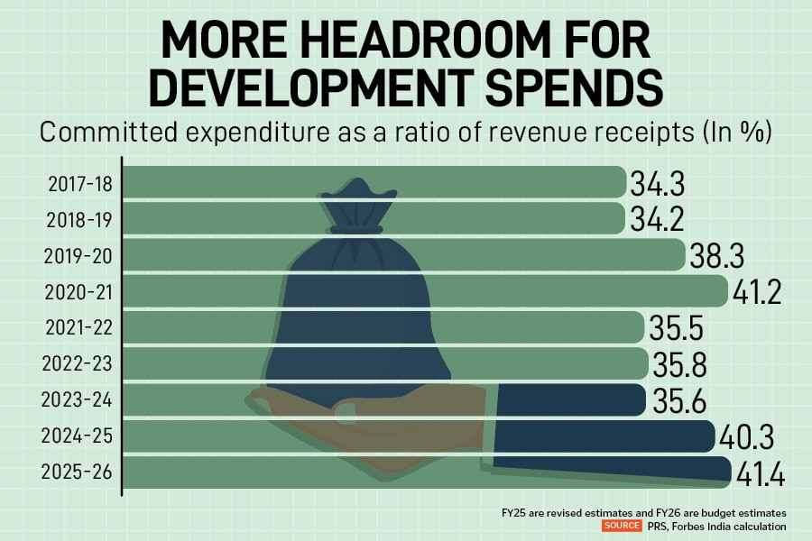 This is even as Bihar has considerable scope for development spends since its committed expenditure remains lower than most states. This fixed cost, which covers salaries, pensions and interest payments, is estimated to increase to 41 percent in FY26 (budget estimates) of total revenue receipts from 34 percent in FY18. In contrast, states like Assam, Himachal Pradesh, Kerala, Punjab and Tamil Nadu are expected to spend more than 60 percent on committed expenses, significantly limiting their government’s policy flexibility to fund new, discretionary projects or massive social schemes.