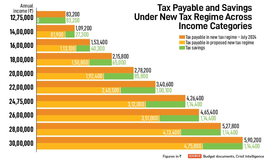 Those earning Rs12,75,000 annually will receive a tax benefit of Rs83,200 compared with the new tax regime of July 2024. For those not eligible for this benefit, the revised tax slabs in the new regime will still increase net cash in hand by a maximum of Rs1,14,400 per annum across income categories (this cap is for annual income over Rs24,75,000 in the proposed new tax regime).