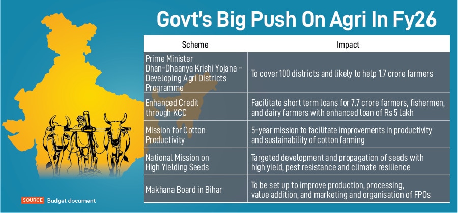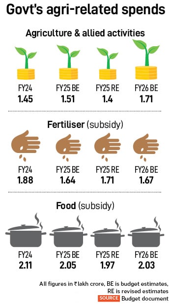 Government's proposal to spend Rs 1.71 lakh crore on agriculture in FY26 is a little above the Rs 1.4 lakh crore in revised estimates in FY25. The budget also promises a series of schemes to benefit f