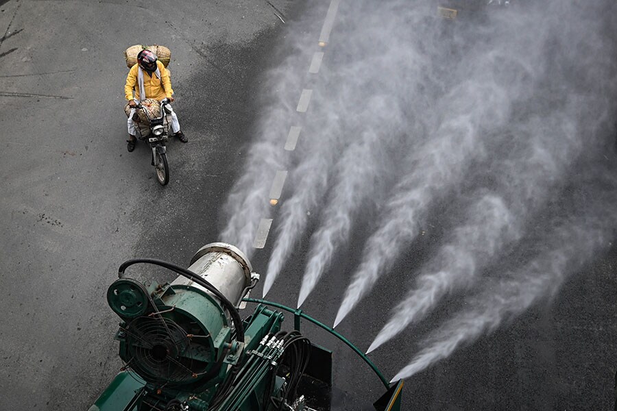 An anti-smog gun deployed on a truck sprays water to settle suspended dust particles during a special drive against pollution at the Delhi Secretariat on November 14, 2023, in New Delhi, India. Air quality experts have notified of its limited effects, stating that cutting down emissions at source is the only solution in the long run.