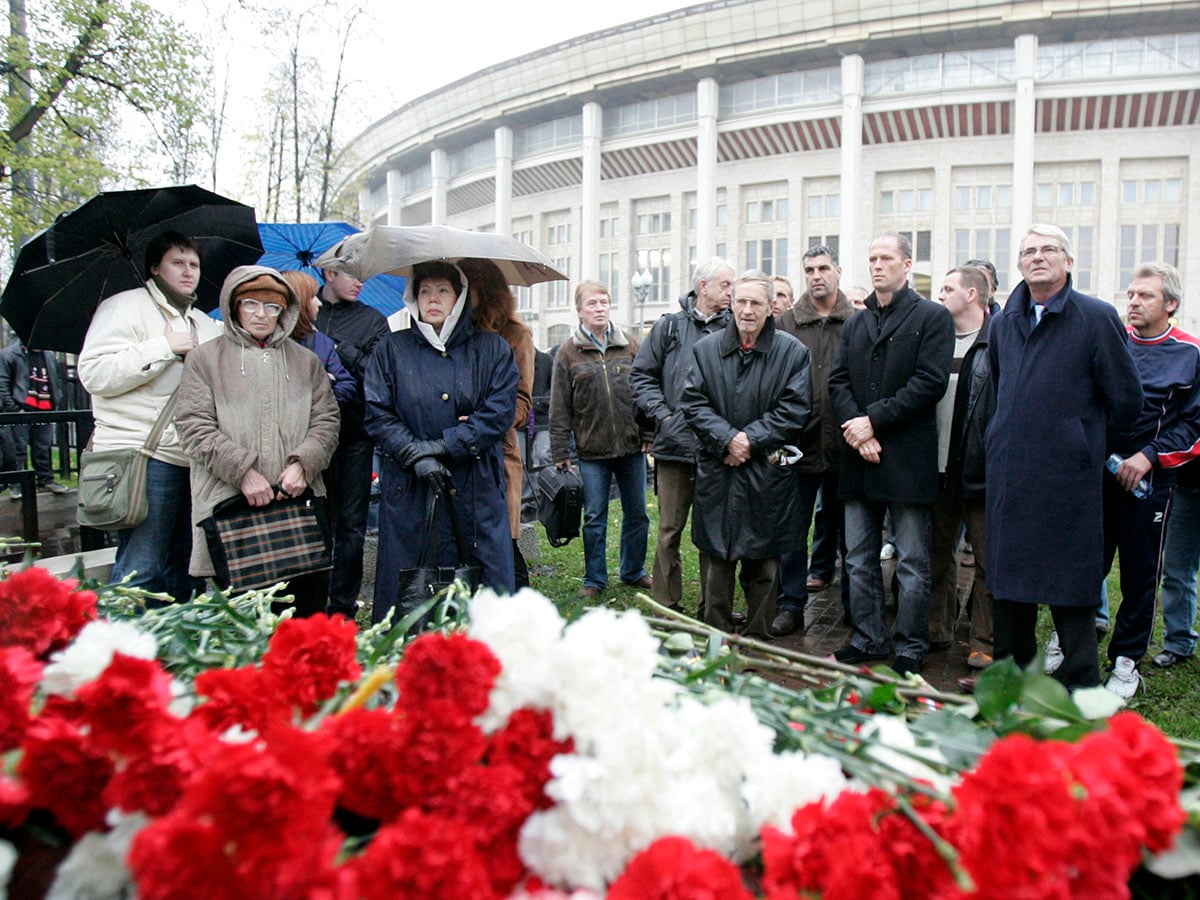 Dutch delegation (R) and relatives stand in a minute silence at the memorial to those who died in a stampede at Moscow"s Luzhniki stadium October 20, 2007. At least 66 fans died in a stampede during the UEFA Cup match between FC Spartak Moscow and HFC Haarlem on October 20, 1982. Image: Reuters/Sergei Karpukhin (RUSSIA)