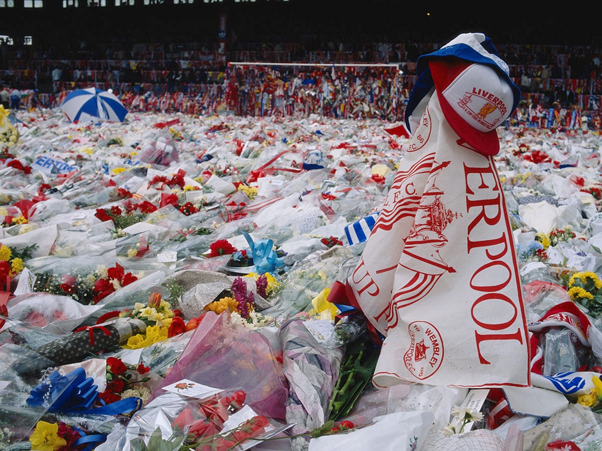Floral tributes cover the pitch at Anfield, Liverpool, during a memorial ceremony held after the Hillsborough disaster, in which 96 Liverpool fans were killed in a crush at the Sheffield stadium, 22nd April 1989. Image: Georges De Keerle/Getty Images