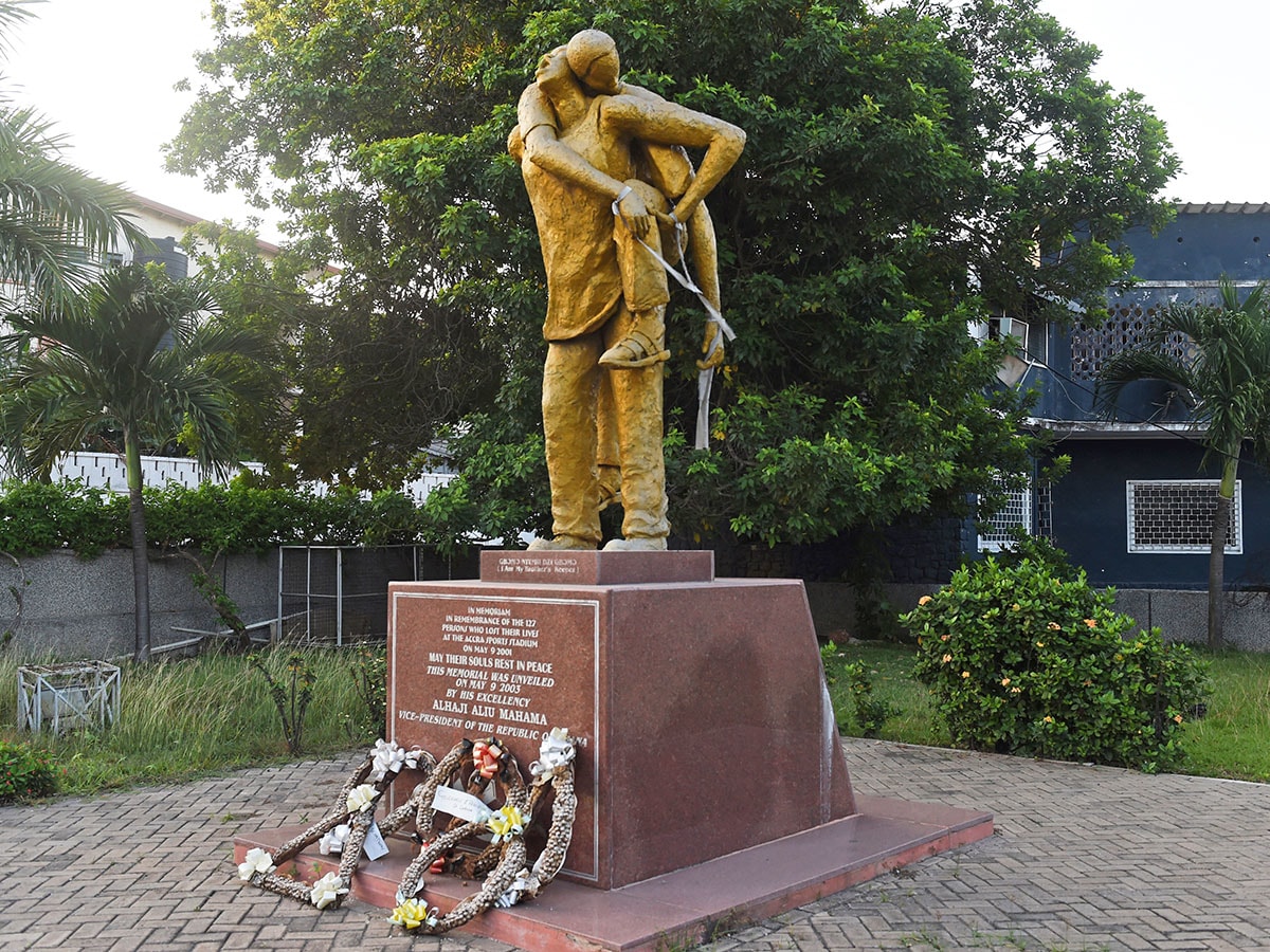 A picture taken on July 12, 2017, shows a memorial for the 127 for who died during a local derby between Kumasi Asante Kotoko Football Club and Accra Hearts of Oak in 2001 at the Accra Sports Stadium. Image: Pius Utomi Ekpei / AFP