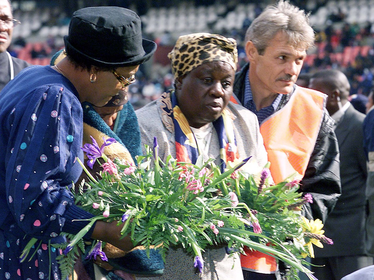 Grieving relatives are helped to lay a wreath for those who died at Johannesburg"s Ellis Park soccer stadium April 15, 2001. 43 people were crushed to death during a match at the stadium on Wednesday in South Africa"s worst sporting accident.Image: JN/CRB/Reuters/Juda Ngwenya